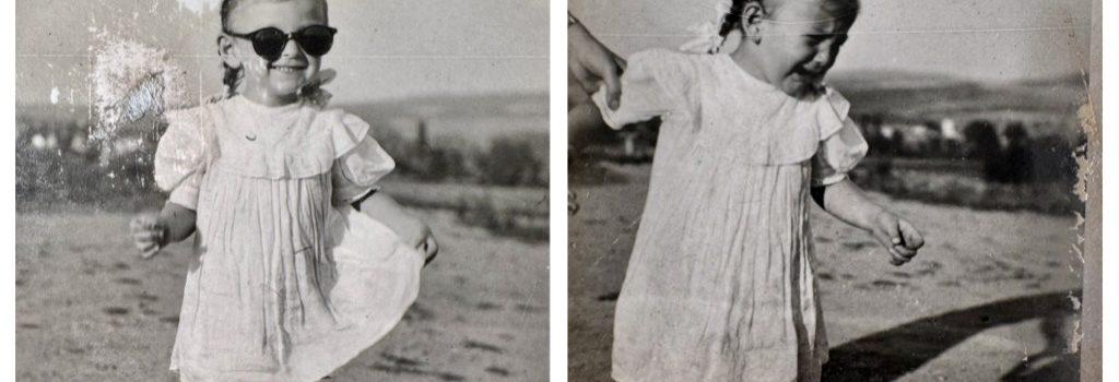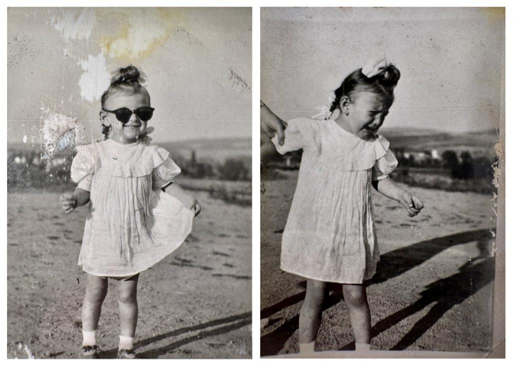 Vajon melyik kép készült előbb? A napszemüveges először és utána a dráma? Vagy a napszemüveg volt a hirtelen vigasz? A táj alapján mintha a drámás lenne az első kép. Az árnyék szöge viszont mintha azt mutatná: a boldogságos jócskán később készült. Amúgy a ruha is mintha más és más hosszú lenne. Lehet, hogy a két képnek semmi köze egymáshoz? Ki tudja. Kár is elemezni.